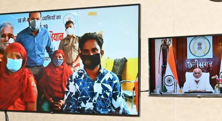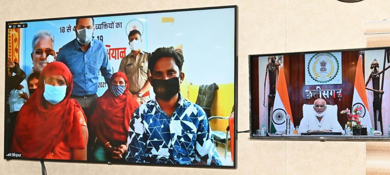 Raipur 01 May 2021. Chief Minister Mr. Bhupesh Baghel today launched a campaign to introduce free corona vaccine to 18 to 44 years old people in Chhattisgarh through video conferencing at his residence office in the capital. During this time he discussed with the people who were vaccinated Covid-19 in Bhilai-Durg, Raipur and Bilaspur and also advised them to follow the rules for prevention of corona infection. On this occasion, he congratulated and congratulated the vaccination team and the people who were vaccinated in the campaign.