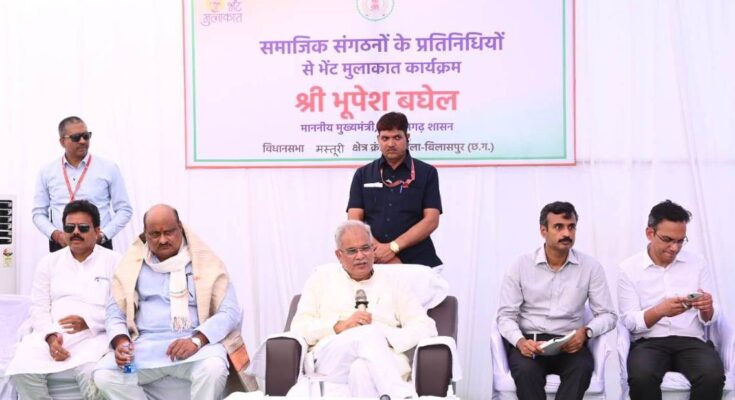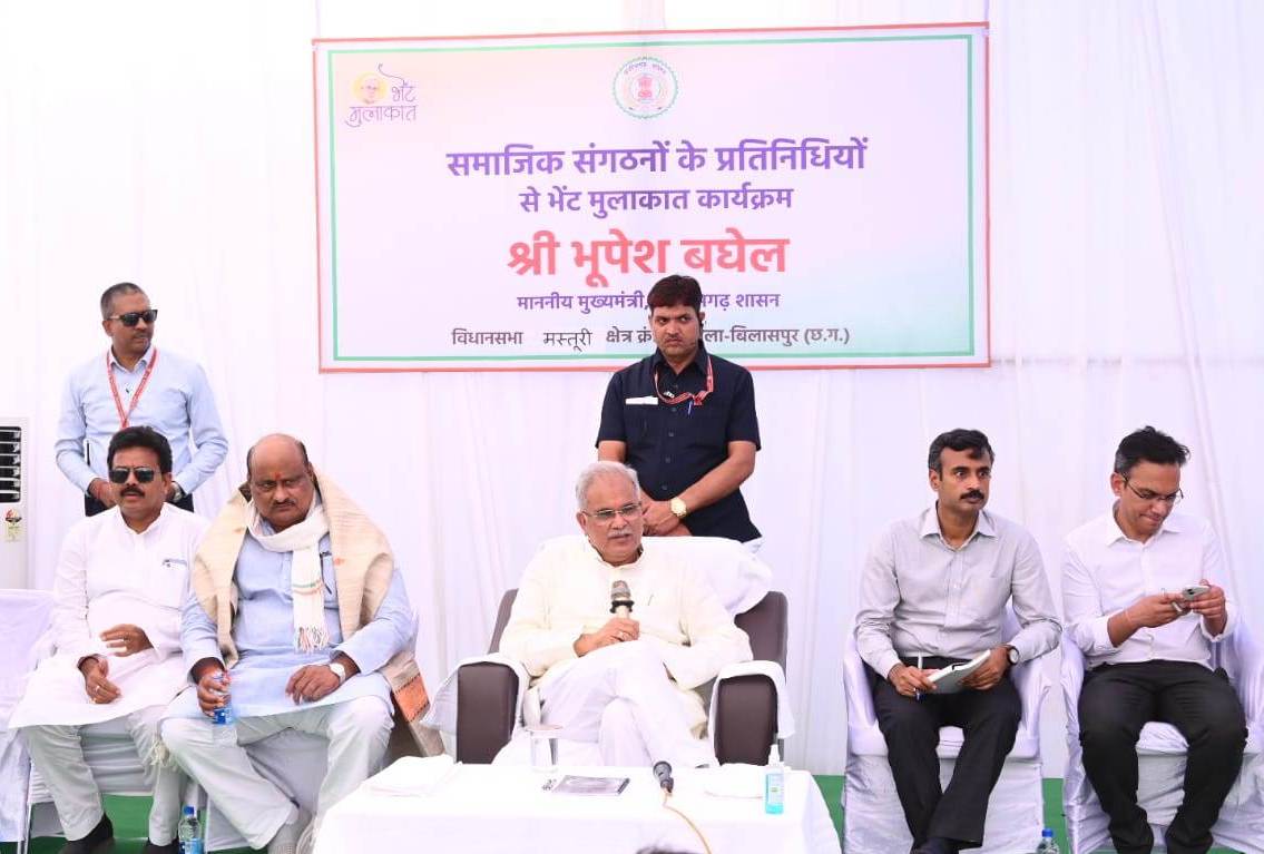 Chief Minister Mr. Bhupesh Baghel today met the general public at Beltukari village and Sipat college ground in Masturi assembly constituency and after seeing the ground reality of implementation of government schemes and programs, met delegations of various societies at NTPC guest house. Did. During this, the Chief Minister also took information about the works and problems of social concern from the social representatives. The Chief Minister said that the government is working for the betterment of all sections of the society. It is our effort that people of all social and class get an opportunity to move forward and become financially capable and self-reliant. During the last four and a half years, our government has started many such innovative schemes, Due to which not only has the involvement of the general public increased, but there has also been a change in their lives. On this occasion, on the demand of the representatives of many communities, the Chief Minister has given instructions to the local administration to solve their problems, apart from sanctioning funds for the construction of social buildings.