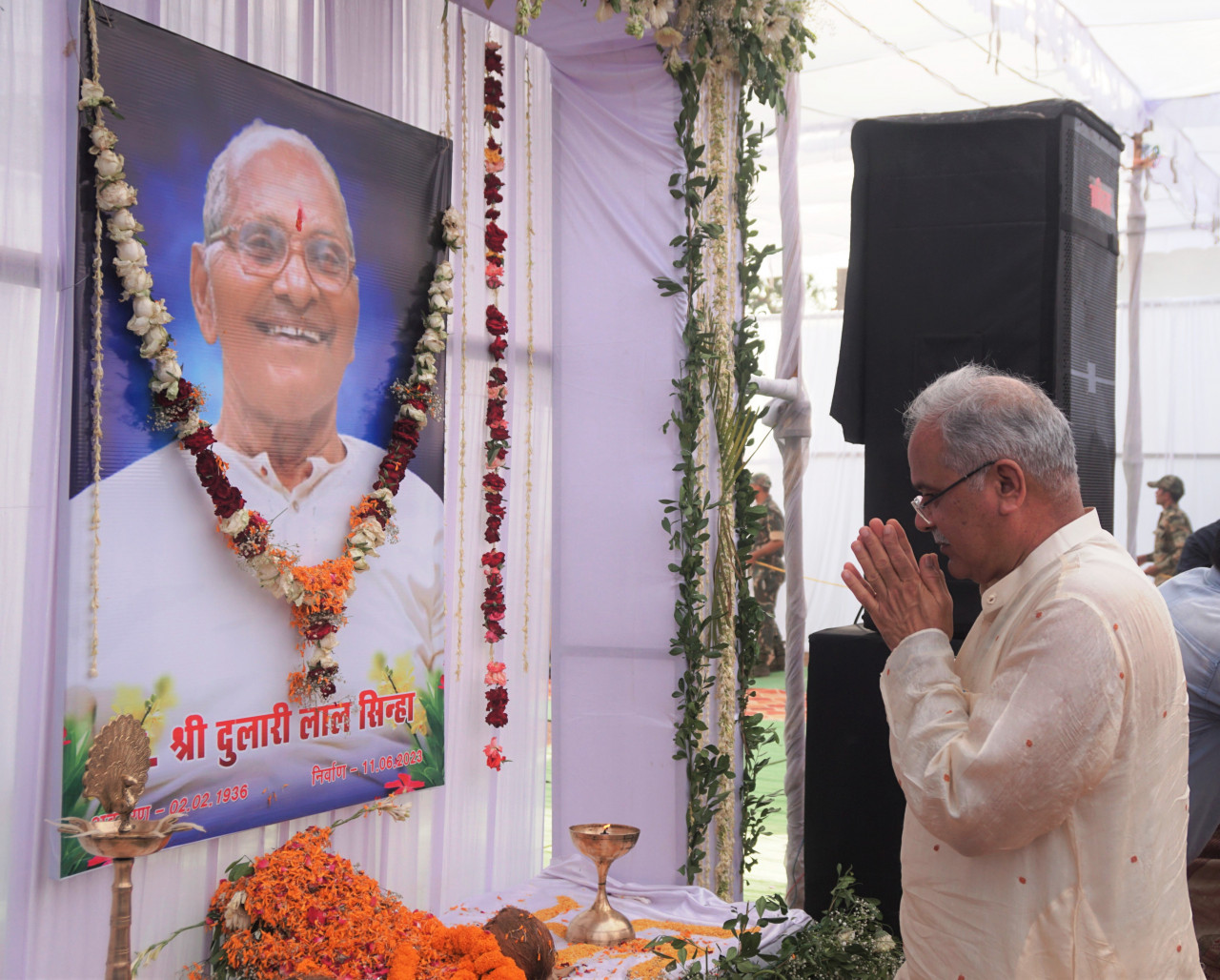 Chief Minister Mr. Bhupesh Baghel reached village Bodra of Gurur development block of Balod district today and participated in the tribute program of Late Mr. Dulari Lal Sinha, father of Sanjari Balod MLA Mrs. Sangeeta Sinha. During this, Chief Minister Mr. Baghel paid a humble tribute to late Sinha by offering flowers on his oil painting. The Chief Minister met Smt. Sangeeta Sinha and her family members in the tribute program and expressed condolences. Assembly Speaker Dr. Charandas Manhat, Home Minister Mr. Tamradhwaj Sahu, Urban Administration Minister Dr. Shivkumar Dahria, Women and Child Development Minister Mrs. Anila Bhediya, Parliamentary Secretary Mr. Kunwar Singh Nishad, MLA Bhanupratappur Mrs. Savitri Mandavi, former MLA Mr. Bhaiyaram Sinha Other public representatives also paid tributes.