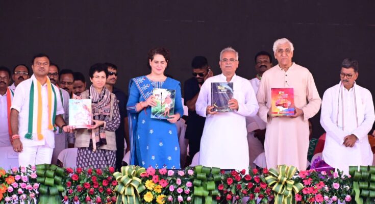 Chief Minister Mr. Bhupesh Baghel and Mrs. Priyanka Gandhi today released the booklets “Purkhati Papers” and “Tana Bana” at the Urban Bodies and Panchayati Raj Mahasammelan, Kanker. In Bastar, a booklet named “Purkhati Papers” (Part One) has been prepared by compiling the community forest rights forms issued to the area-wise tribal communities by documenting the beliefs prevalent in the oral traditions of the Gods and Goddesses. There is a compilation of Khasras preserved in “Purakhti Papers” (Part-II), in which the revenue records have been preserved by mentioning the names and area of Mataguri, Devguri in the Kaifiyat column of Khasra through Bhuiya.