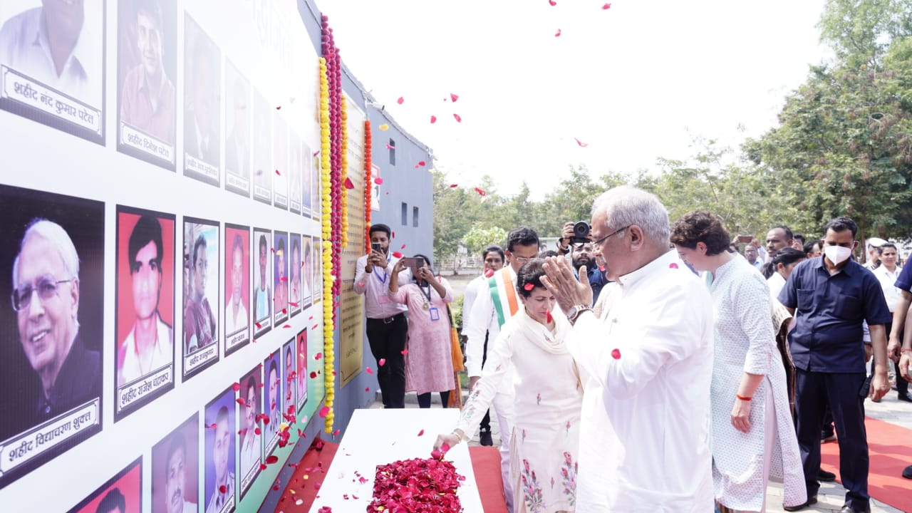Raipur: Chief Minister Mr. Bhupesh Baghel and special guest Mrs. Priyanka Gandhi reached the Jheeram Memorial and paid floral tributes to the martyrs’ statues.