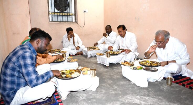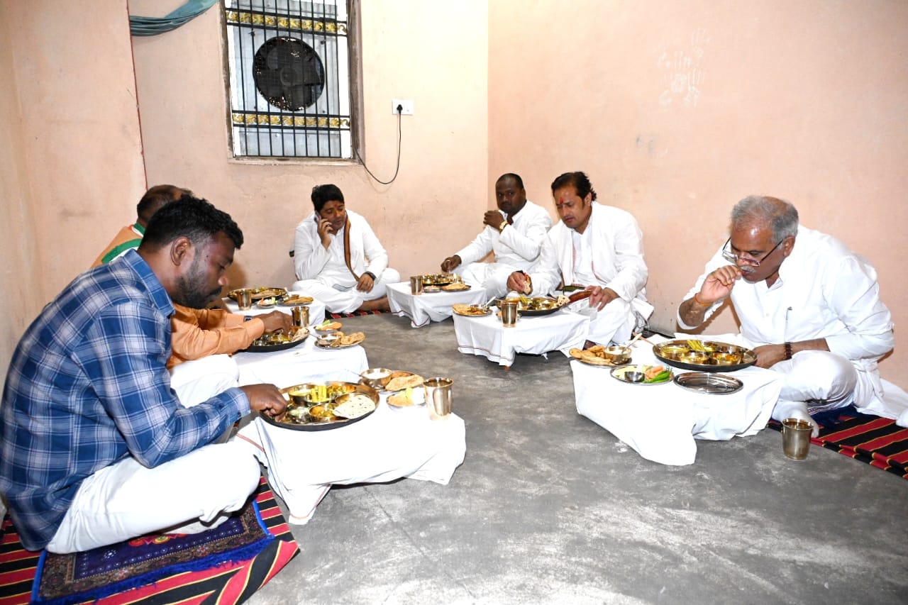 Mr. Pyarelal Yadav and Mrs. Girija Yadav expressed their happiness on receiving the Chief Minister as a guest. The Chief Minister relished the delicious Chhattisgarhi food served with simplicity by the Yadav family members. The family served rice, dal, roti along with chench bhaji, adauri badi, mix veg, gilki jhurga, semi bhata, khedha, salad and papad to the Chief Minister with full intimacy.