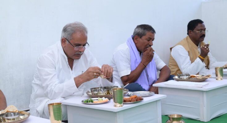Chief Minister Mr. Bhupesh Baghel is not only solving their problems by communicating directly with the general public during the meeting program, but also promoting Chhattisgarhi culture, food and lifestyle. Chief Minister Mr. Baghel reached the house of farmer Mr. Biselal Sahu in Fingeshwar today to receive food. Happiness was clearly visible on the faces of Mr. Biselal’s family members on reaching the Chief Minister’s house. He welcomed the Chief Minister with full intimacy.