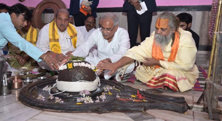 Chief Minister Mr. Bhupesh Baghel visited Jagatguru Shrimad Vallabhacharya ji and Shri Champeshwar Mahadevji in Champaran today and sought blessings of happiness, peace and prosperity for the people of the state. On this occasion, Abhanpur MLA Mr. Dhanendra Sahu, former MLA and Chairman of Gau Sewa Ayog Mahant Shyam Sundar Das and District Panchayat President Mrs. Domeshwari Verma were also present.