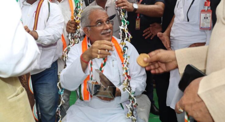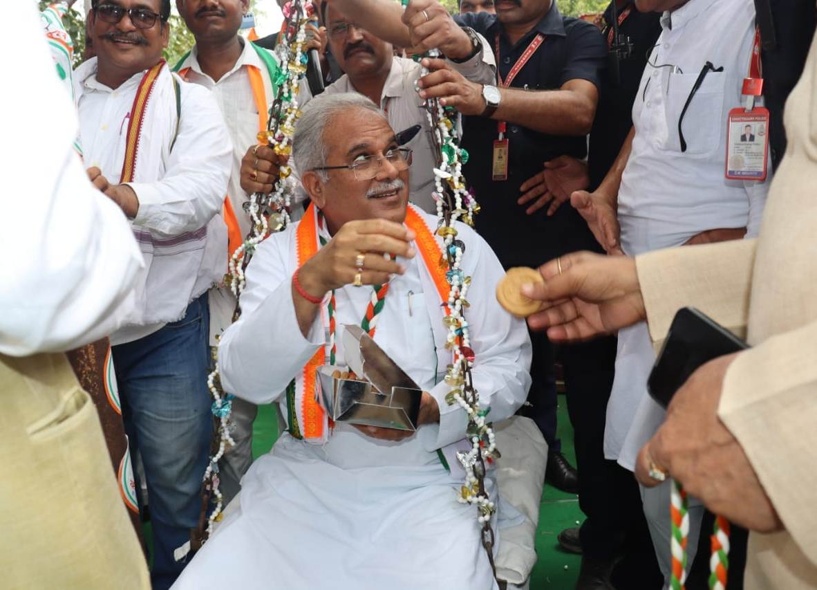 Chief Minister Mr. Bhupesh Baghel was welcomed by local residents and public representatives by weighing him from the famous Hasaud tree on his arrival at Birra Gram Panchayat. On this occasion, Assembly Speaker Dr. Charan Das Mahant, Home Minister Mr. Tamradhwaj Sahu, Parliamentary Secretary and MLA Bilaigarh Mr. Chandradev Rai, MLA Chandrapur Mr. Ramkumar Yadav, Chairman of Mineral Development Corporation Mr. Girish Dewangan, Chairman of Telghani Development Board Mr. Sandeep Sahu, members of Gauseva Commission President Rajeshree Mahant Dr. Ramsunder Das, President of Shakambhari Board Mr. Ramkumar Patel, District President Mr. Raghavendra Singh, Dr. Choleshwar Chandrakar, dignitaries were present in large numbers