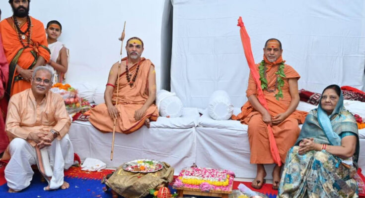 Raipur 29 May 2023. Chief Minister Mr. Bhupesh Baghel warmly welcomed Sharadapeethadhishwar Jagadguru Shankaracharya Swami Sadanand Saraswati Ji Maharaj and Jyotishpeethadhishwar Jagadguru Shankaracharya Avimukteshwaranand Saraswati Ji Maharaj at his residence today. He along with his family members received blessings from the Maharaj by worshipping their “Paduka”. He wished for the happiness, peace, and prosperity of the people of the state.