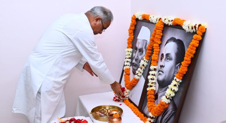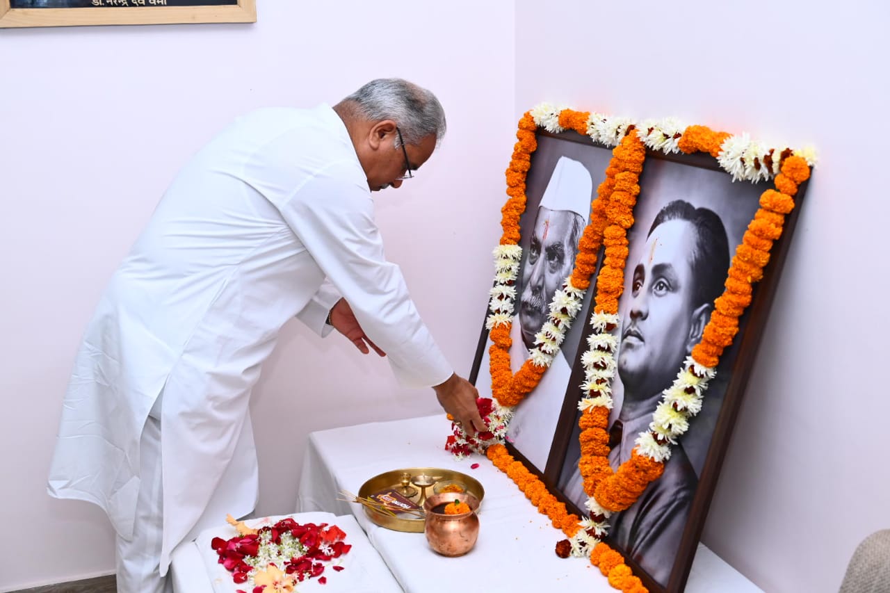 Raipur : 03December 2022, Chief Minister Shri Bhupesh Baghel paid floral tributes to the portraits of first President of independent India and freedom fighter Bharat Ratna Dr. Rajendra Prasad and the magician of hockey Major Dhyan Chand at his residence office here today. Today marks Dr. Rajendra Prasad’s birth anniversary and Major Dhyan Chand’s death anniversary. Recalling the contribution of Dr. Rajendra Prasad, Chief Minister Shri Baghel said that Rajendra Babu was an Indian politician, lawyer, Indian independence activist, and scholar. He played an important role in shaping the Indian constitution as the President of the Constituent Assembly. Dr. Rajendra Prasad presented an example of independent and fair work while serving as the President. His great life values and invaluable thoughts will continue to inspire us.Chief Minister Shri Baghel recalled the achievements of the magician of hockey Padma Bhushan Major Dhyan Chand on his death anniversary and his invaluable contribution in the field of sports, saying that India won three gold medals in the Olympic Games due to the magical game of Major Dhyan Chand. Major Dhyan Chand’s dedication towards sports and patriotism is an inspiration to all of us.