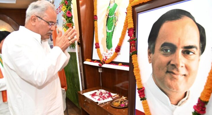 Chief MinisterBhupesh Baghel paid homage to the former Prime Minister of the country, Bharat Ratna Shri Rajiv Gandhi by paying floral tributes at his portrait on the occasion of ‘Sadbhavna Diwas’ on his birth office here today.