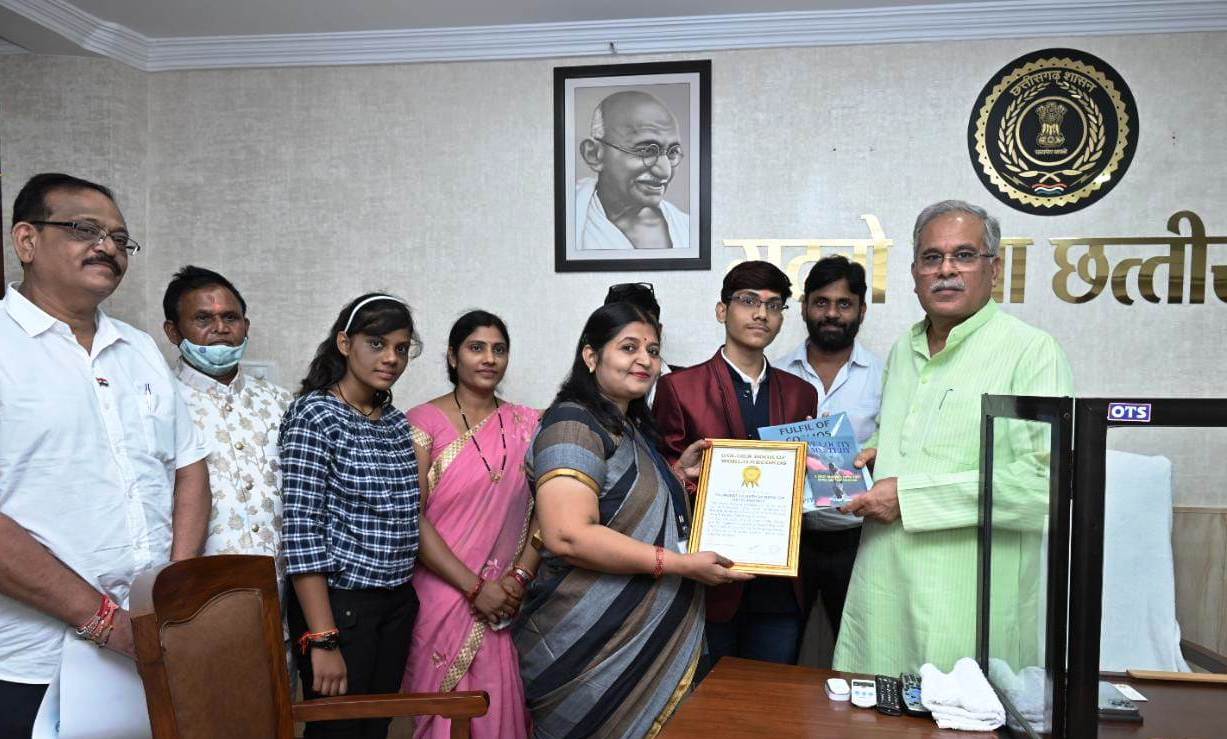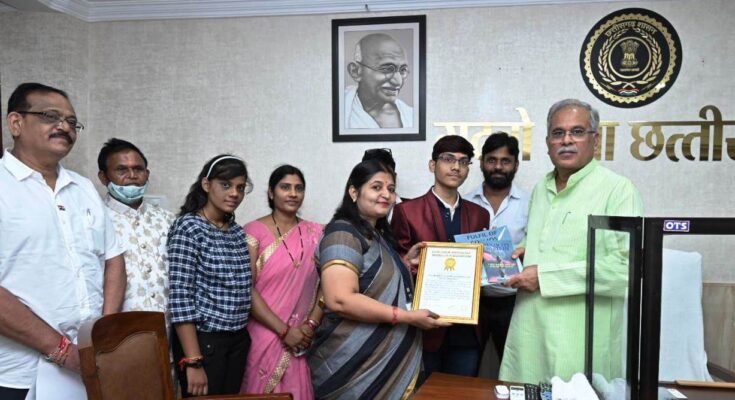 The Golden Book and World Record certificate were presented to the child scientist and author Piyush Jaiswal before the Chief Minister. He told the Chief Minister that he had obtained his PhD degree at the age of 13 from IJSER, a recognized journal of USA. The Chief Minister congratulated and congratulated the child scientist and writer Shri Piyush Jaiswal for the remarkable achievement achieved at a young age and wished him for his bright future. Members of Chhattisgarh Home Construction Board Shri Vinod Tiwari, Shri Karthik Ram Jaiswal, Shri PL Jaiswal, Smt. Sunita Jaiswal, Ms. Sakshi Jaiswal and other Yogas were present on this occasion.