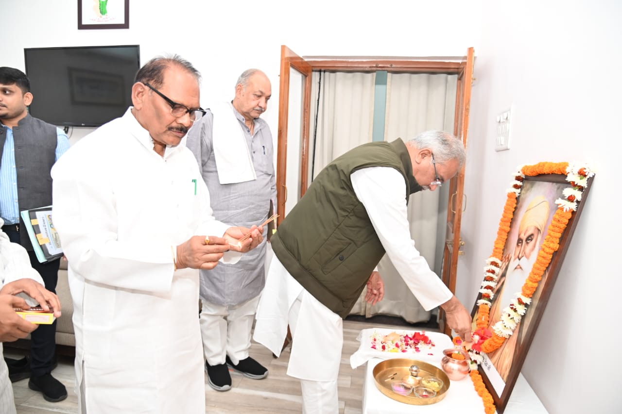 Chief Minister Shri Bhupesh Baghel paid homage to Guru Nanak Dev ji by paying floral tributes to him on his birth anniversary at his residence office here today. Agriculture Minister Shri Ravindra Choubey and School Education Minister Dr. Premsai Singh were also present on this occasion. He extended greetings and best wishes to the people of the state, especially the people of the Sikh community, on the occasion of Guru Nanak Jayanti. Chief Minister Shri Baghel said that the birth anniversary of the first Guru Nanak Dev Ji of Sikhism is celebrated with gaiety in the form of Guru Parab and Prakash Parv. A unique combination of Guruvani, Ardas, Kirtan, Langar, and service is seen on this day in Gurudwaras across the country. Guru Nanak ji has given the message of love, unity, equality and brotherhood to the world. His teachings are relevant even today and inspire people to live a life of service with love and harmony.