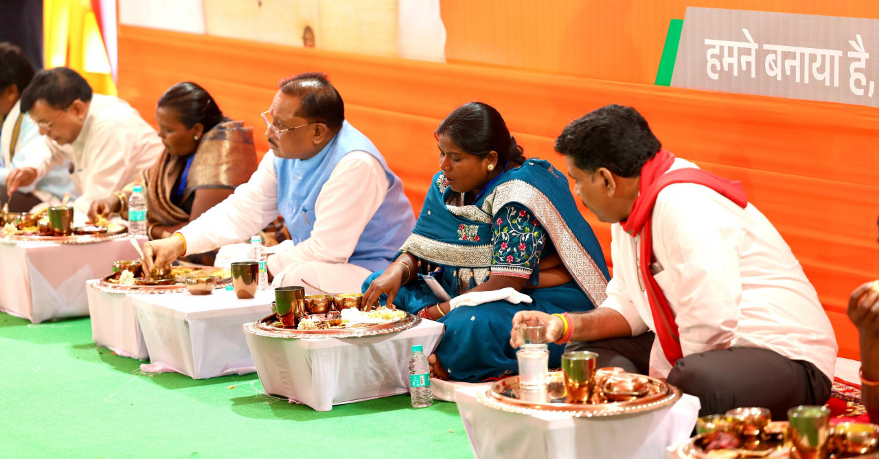 Chief Minister Shri Vishnu Dev Sai had lunch with the beneficiaries of Pradhan Mantri Awas Yojana after the ‘Today More Housing-More Rights’ program. During this, Chief Minister Shri Sai talked to Smt. Fulgensia Ekka, resident of Kunkuri of Jashpur district and Smt. Kusum of Farasbahar, who were having lunch together, and enquired about their well-being and that of their families. Those who had lunch with the Chief Minister included Shri Ram of Jashpur, Shri Daulatram and Shri Lalaram of Kabirdham, Shri Lahendra Singh and Smt. Sonamni of Bastar, Shri Mahesh and Shri Samaru Sahu of Mungeli, Smt. Purnima Patel of Kanker, Smt. Hemin Dhruv of Balodabazar, Smt. Rambati Puraina and Shri Jattasingh of Raipur.