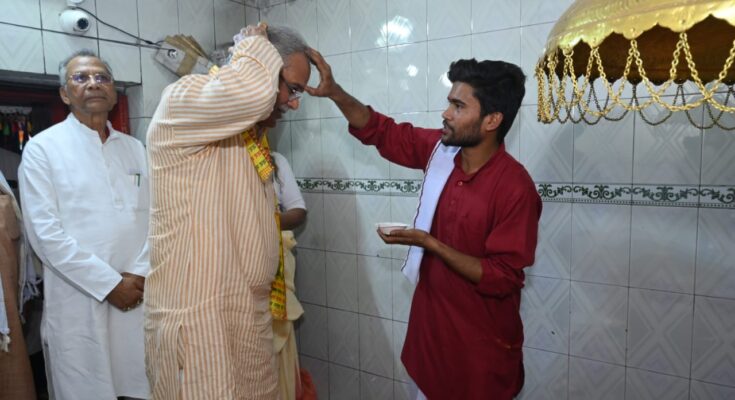 Raipur, 10 April 2022. Chief Minister Shri Bhupesh Baghel today offered prayers to Mata Kaushalya at Chandkhuri, Raipur on the auspicious occasion of Ram Navami. Reaching Chandkhuri this afternoon, the Chief Minister bowed his head at the temple of Mata Kaushalya and offered prayers by law and wished for the happiness and prosperity of all the people of the state.