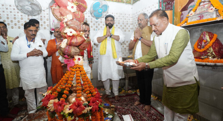 Chief Minister Shri Vishnu Dev Sai today prayed at the Shiv temple located in Kilkila village of Pathalgaon tehsil and prayed for the happiness, prosperity and well-being of the people of the state. The Chief Minister also received blessings from the chief priest of Kilkila Dham, Shri Shri 1008 Swami Kapildas Ji Maharaj. The chief priest presented a shawl and coconut to Chief Minister Shri Sai as a blessing.