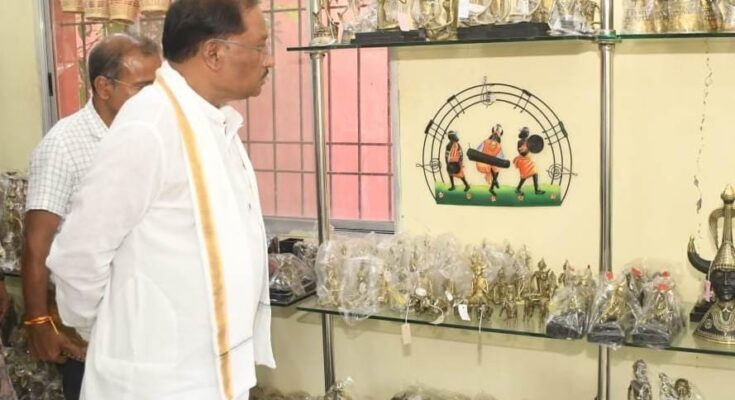 Chief Minister Shri Vishnu Dev Sai visited Shabari Emporium on his arrival at Shilpnagari Kondagaon today. During this, he saw and appreciated the artworks depicting the lifestyle and rich tribal cultures of Bastar made of bell metal, wrought iron, bamboo and wood crafts. He met the craftsmen here and inquired about the manufacturing process and marketing of various artworks including bell metal. The craftsmen presented artwork made of bell metal to the Chief Minister.