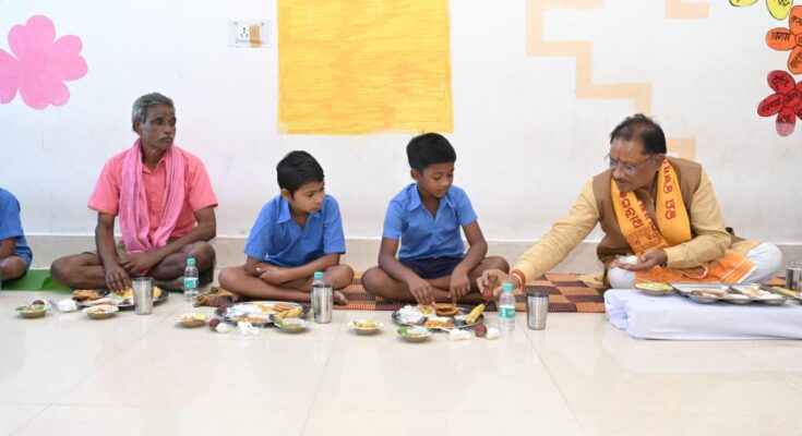 On the occasion of his birthday today, Chief Minister Shri Vishnudev Sai hosted a banquet for the children of Balak Ashram School in Bagiya. He ate with the children sitting on the ground. While caressing the children, he also distributed sweets from his plate to the children sitting next to him, Anuj and Sumit, and told them to study diligently. The little children were also very excited to find Chief Minister Shri Sai among them and told the Chief Minister that “CM Sir will come and meet us.” Chief Minister Shri Sai smiled at this innocent behavior of the children and said that the garden is my home so I will keep coming to meet you people.