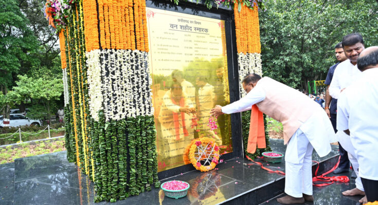 Chief Minister Shri Vishnu Dev Sai today paid tribute to the forest martyrs by reaching Rajiv Smriti Van in the capital Raipur on the occasion of National Forest Martyrs’ Day. He unveiled the Forest Martyr Memorial in the memory of forest martyrs. All present including Chief Minister Shri Sai observed two minutes of silence and paid tribute to the martyrdom of forest martyrs.