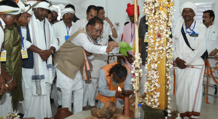 Chief Minister Shri Vishnudev Sai today attended the closing ceremony of Marka Pandum (Chaitarai Mahaparva) organized by Gondwana Samaj in village Bhirawahi of Kanker. He offered Tendu, Char, Chironji, Mahua and Mango fruits after worshipping the deities of Gondwana Samaj, Budhadev and Anga Dev and prayed for the prosperity of the people of the state.