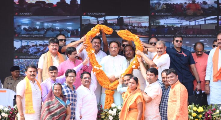 Chief Minister Shri Vishnudev Sai was welcomed and honored by the local people with Gajmala.