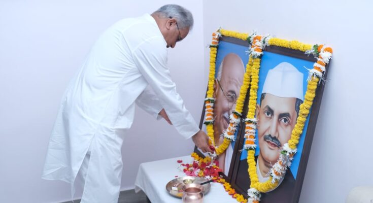 Raipur, 02 October 2021. Chief Minister Bhupesh Baghel paid homage to the Father of the Nation Mahatma Gandhi and former Prime Minister Late Shri Lal Bahadur Shastri on the occasion of his birth anniversary at his residence office here today. School Education Minister Dr. Premsai Singh Tekam was also present on the occasion.