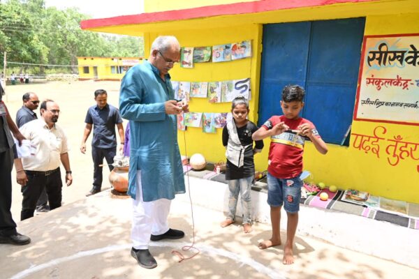 Raipur, 25 May 2022. As a response to the school closure, youth of Dabaguda village of tribal-dominated Bastar district undertaken a unique initiative of starting a learning center to ensure uninterrupted learning of children during the time of Covid-19 pandemic. A total of 32 children were provided education along with sports activities for their holistic development in this learning center opened as per the instructions of district collector. Jeevan Das, a class 5 student, showed Chief Minister his learning center. He also displayed his sport skills in traditional games like ‘gilli danda’ and ‘bhaura’ (spinning top). Lastly, he said that I like skipping rope. ‘Aap bhi kud kar dikhao’, he innocently asked Chief Minister. Mr. Baghel decided to skip some rope on his sweet request. Chief Minister also enjoyed playing ‘gilli-danda’ and spinning top with the children, which made them excited and happy.