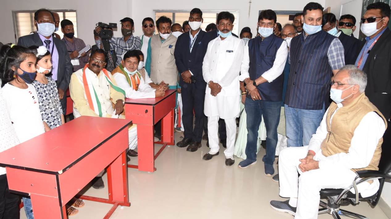 Raipur 04 December 2020 The Chief Minister Shri Bhupesh Baghel inspected Atmanand Government Excellent English Medium School located at Dipatoli here during his stay in Jashpur today. Students of fourth and second grade of the school welcomed the Chief Minister with welcome song and thanked for the establishment of English medium school. The children presented information about the historical and archaeological heritage and tourist place of Jashpur in a very easy way through mutual communication. Chief Minister Mr. Baghel was overwhelmed by hearing the fluency in English from the children of primary class. He praised the children and said to brighten the name of Jashpur after studying a lot.