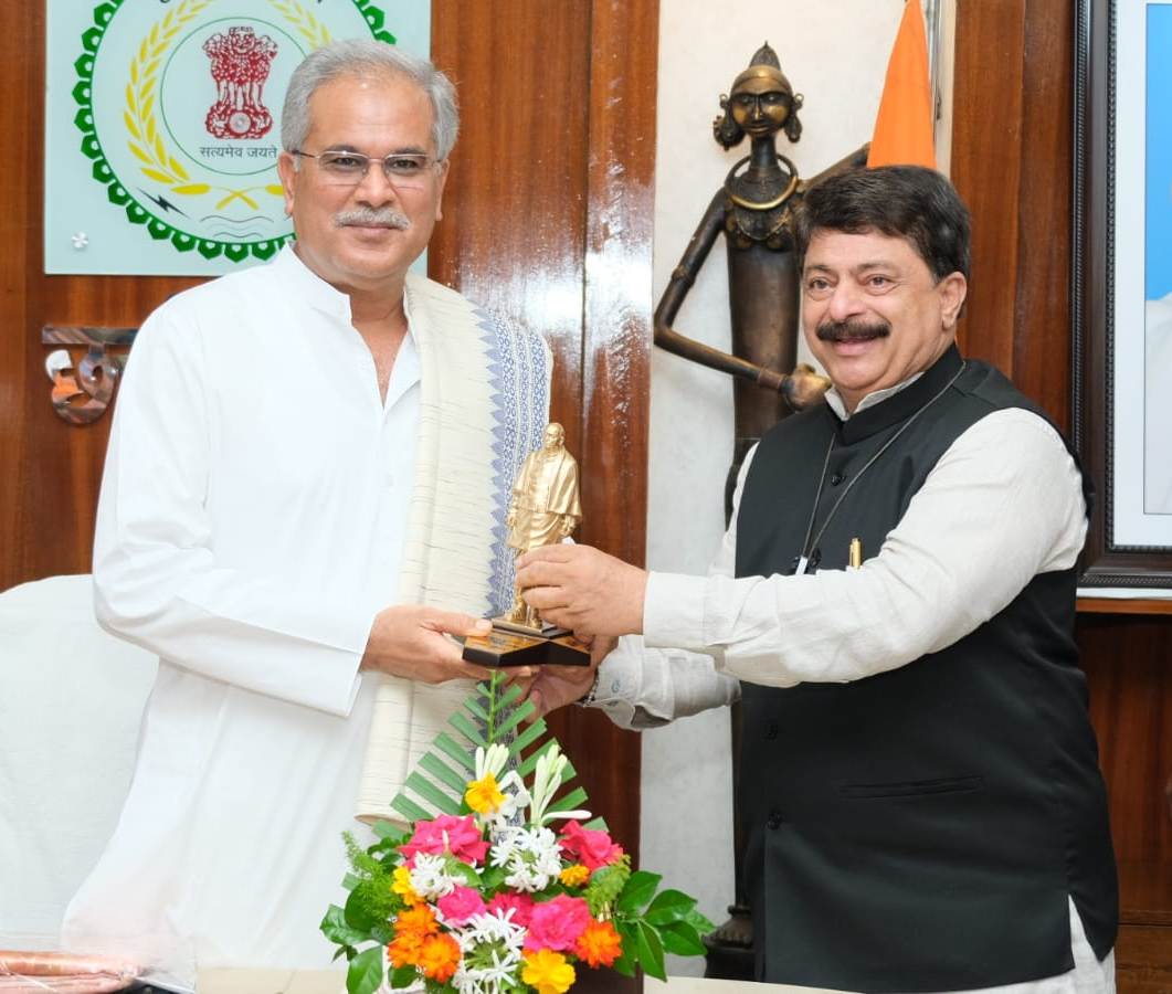 Raipur, 29 August 2021. The delegation led by the Speaker of Gujarat Legislative Assembly, Mr. Rajendra Trivedi, met Chief Minister Mr. Bhupesh Baghel. In this meeting held at the Chief Minister’s residence office this evening, Chief Minister Mr. Baghel invited the delegation to visit Bastar next time. He said that the importance of Chhattisgarh has been there in every era. People of all classes live together here. He informed the delegation in detail about the importance of Chhattisgarh in the archaeological, historical and mythological period. On this occasion a delegation from Gujarat presented a replica of the Statue of Unity to Chief Minister Mr. Baghel. The Chief Minister also honored the delegation by presenting them a shawl and a memento.