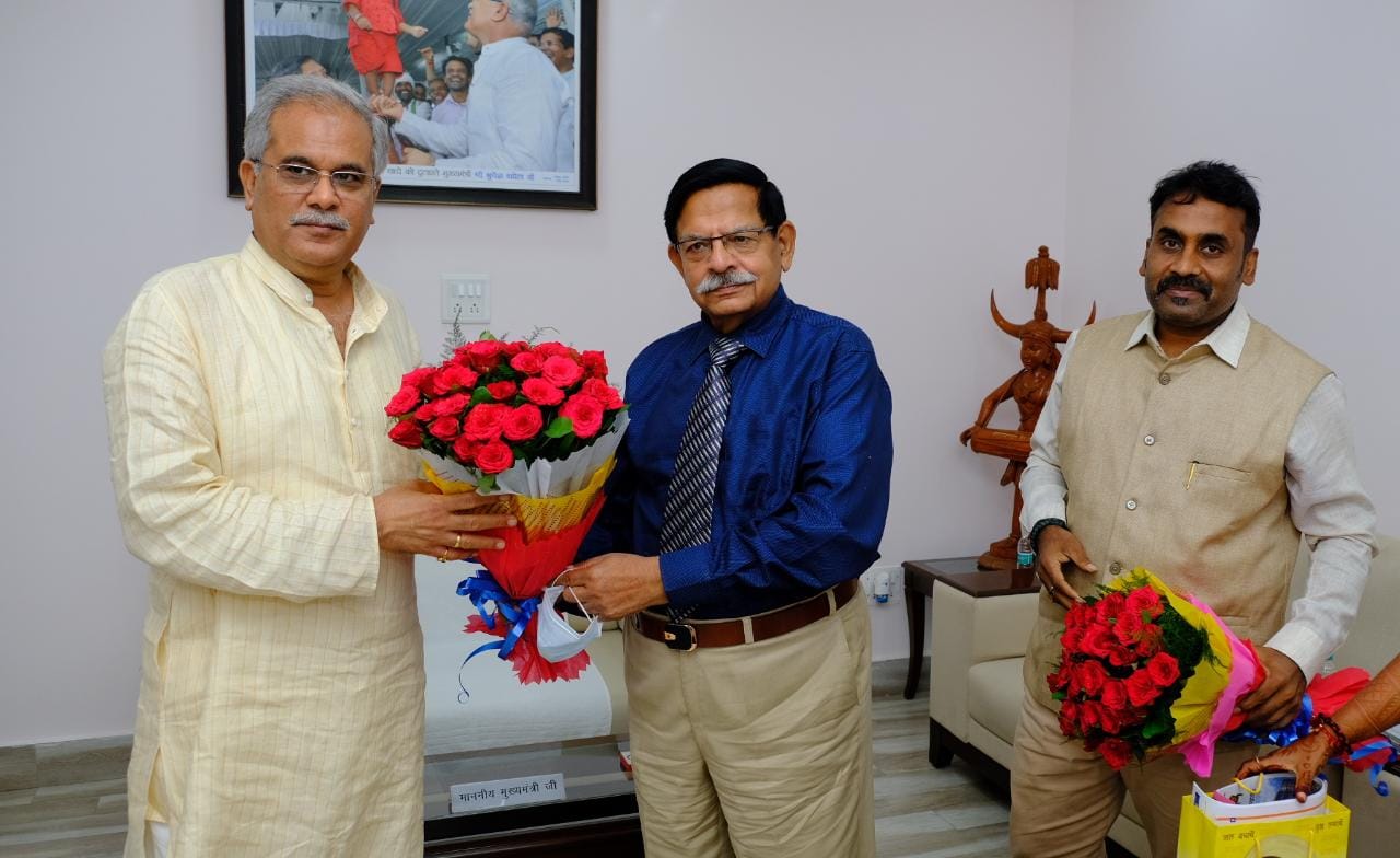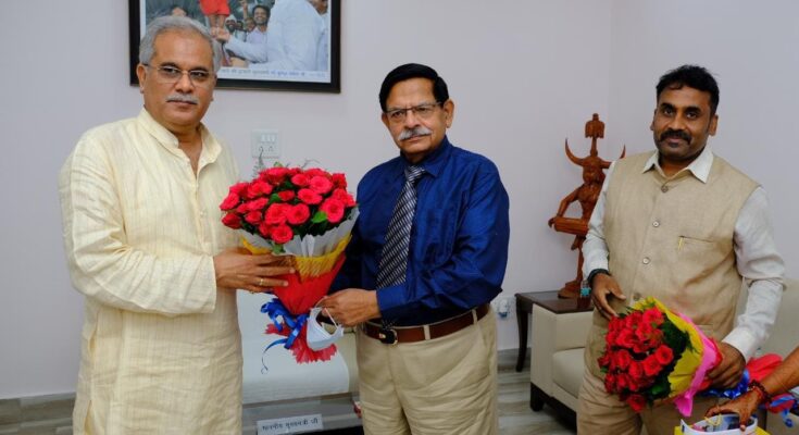 The delegation invited Chief Minister Mr. Baghel to attend the inauguration of the newly constructed Engineering Block building at the Sri Rawatpura Sarkar University Campus and the unveiling of the name plaque of the new roads constructed in the university campus as the chief guest. Mr. Rajiv Mathur told Chief Minister Mr. Baghel that engineering block would be named after great engineer Bharat Ratna Dr. M Visvesvaraya and new roads would be named after great personalities. He said that this program would be organized in the last week of September. The Chief Minister Shri Bhupesh Baghel, while thanking for the invitation, expressed happiness over the ongoing infrastructure construction work in the university to provide better education facilities. Vice Chancellor Dr. Rajesh Pathak, OSD Ms. Monika Mishra and Head of Yoga Department, Dr. Kaptan Singh were present on the occasion.