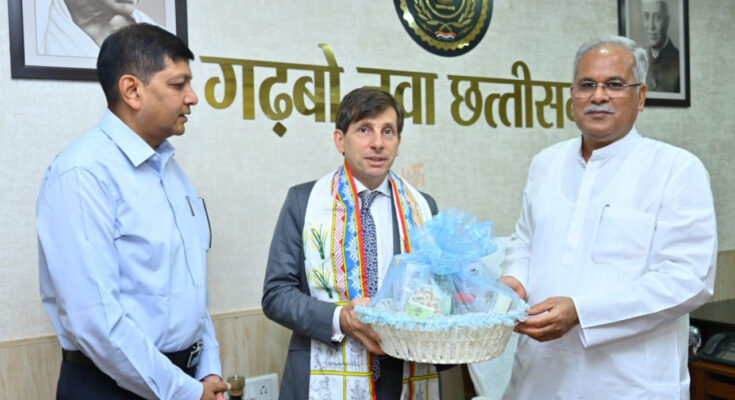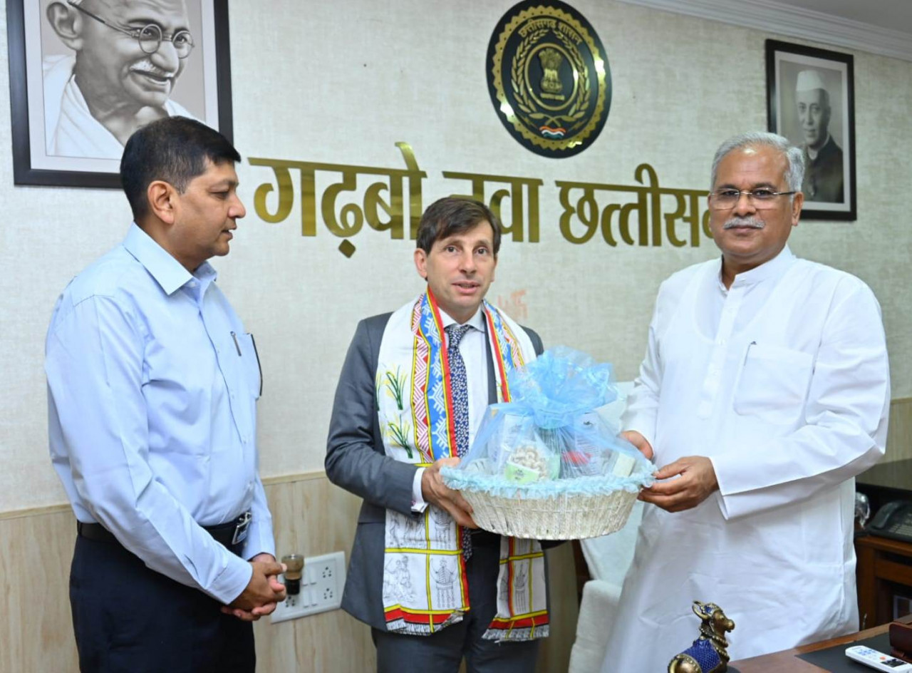 The Consul General of France Mr. Jean-Marc Serre-Charlotte paid a courtesy call on the Chief Minister Mr. Bhupesh Baghel at his residence office here today. During this, Chief Minister Mr. Baghel presented Chhattisgarh herbal product, state gamchha and state animal ‘Vanbhainsa’ made of bell metal insignia to the Consul General. Chief Secretary Shri Amitabh Jain was also present on the occasion.