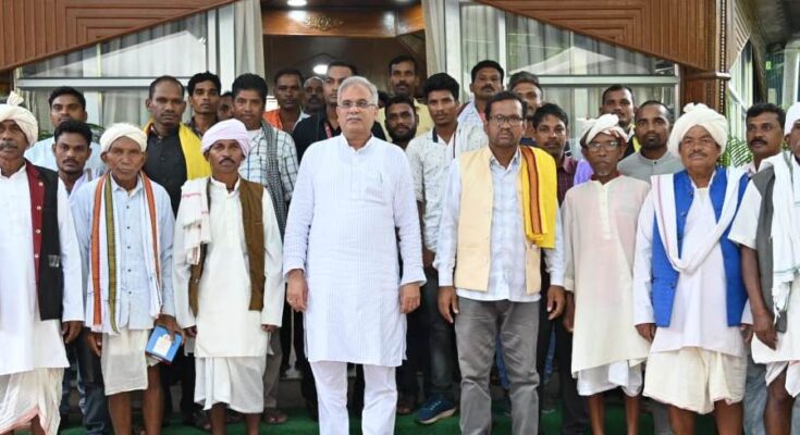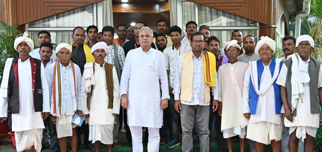 A delegation of Gond community from Manpur block of Mohla-Manpur-Chowki district called on Chief Minister Mr. Bhupesh Baghel at his residence office this evening. The delegation extended greetings and best wishes to the Chief Minister on the occasion of Hareli festival yesterday and discussed various social and regional development issues. The delegation handed over a memorandum to Chief Minister Mr. Baghel regarding the reconstruction and beautification of Gondwana Bhavan and faith center Raital Dev Devkondai in Manpur. The Chief Minister agreed to the demands made by the Gond community. He also inquired about the condition of rain and agriculture from the people in the delegation and congratulated everyone on the occasion of Hareli festival. On this occasion, President of Gond Samaj Manpur Block Mr. Dinesh Usendi, Mr. Bhanuram Tulavi, Mr. Manguram, Mr. Chiman Sahwalko, Mr. Barsai and many people were present.