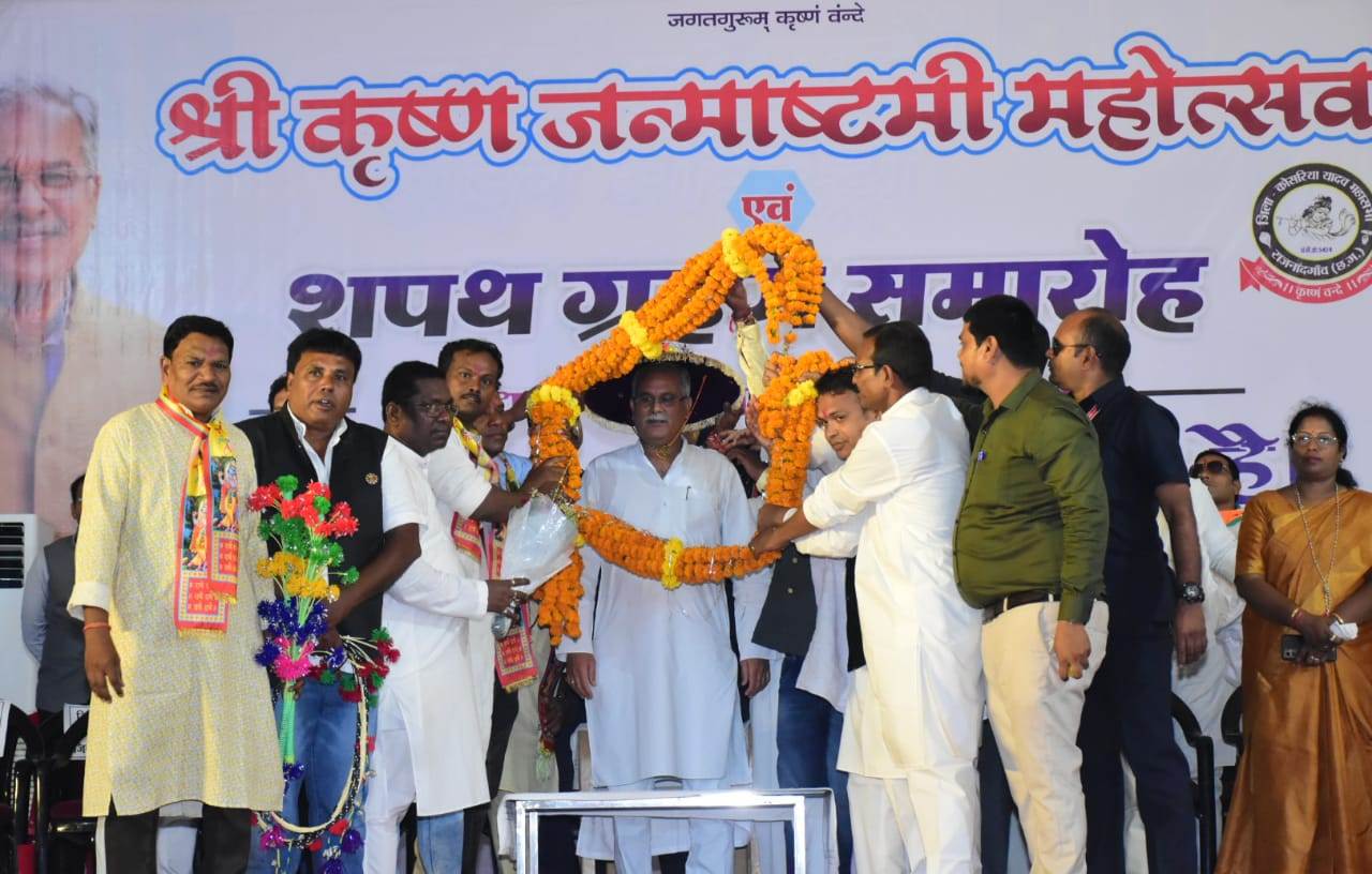 Chief Minister Shri Bhupesh Baghel today attended the Shri Krishna Janmashtami Mahotsav and oath taking ceremony organized by District Nagar Kosaria Yadav Mahasabha Rajnandgaon at Padmashree Govindram Nirmalkar Auditorium, Rajnandgaon. On this occasion, the Chief Minister was traditionally greeted by wearing a Khumri. At the function, Chief Minister Mr. Bhupesh Baghel extended hearty congratulations and best wishes to everyone on Shri Krishna Janmashtami. On this occasion, he wished for the happiness and prosperity of the people of the state. Chief Minister Shri Bhupesh Baghel administered the oath to the newly appointed office bearers of the society. He said that Yadav community is a hardworking society and has always been serving Mother Cow. The path shown by Lord Shri Krishna, We are still following it even today. He said that cow rearing is not only linked to our religious faith but also to the economy. Cow rearing has special importance due to its connection with agriculture. In the present times the situation has changed due to industrialization. To strengthen the economy in rural areas, the government is purchasing cow dung under the Godhan Nyay Yojana. On the one hand, through this scheme, cow service has been done, on the other hand, cow herders have sold cow dung worth up to Rs 2 lakh. He said that there are more than 10 thousand Gauthans in the state, out of which 6 thousand Gauthans have become self-reliant. Through Gauthan Committee, Gauthans are gradually becoming self-reliant and this system will continue forever. He said that along with this, cow urine is also being purchased from which Jeevamrit and pesticides are being made. Out of which 6 thousand Gauthans have become self-reliant. Through Gauthan Committee, Gauthans are gradually becoming self-reliant and this system will continue forever. He said that along with this, cow urine is also being purchased from which Jeevamrit and pesticides are being made. Out of which 6 thousand Gauthans have become self-reliant. Through Gauthan Committee, Gauthans are gradually becoming self-reliant and this system will continue forever. He said that along with this, cow urine is also being purchased from which Jeevamrit and pesticides are being made.