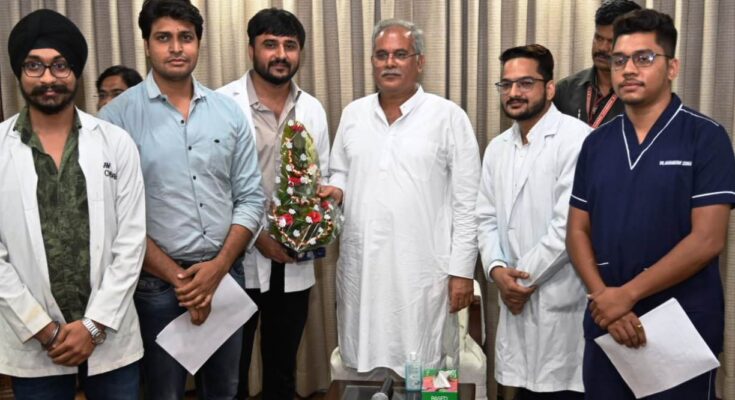 The delegation of Junior Doctors Association, Chhattisgarh paid courtesy call on Chief Minister Mr. Bhupesh Baghel at his residence office here this evening. During the meeting with Chief Minister Mr. Baghel, discussions were held regarding the association by the delegation. On this occasion, the office bearers of the association Dr. Prem Chaudhary, Dr. Gaurav Parihar, Dr. Pritam Prajapati, Dr. Himanshu Sinha and Dr. Gagan Mohan etc. were present.