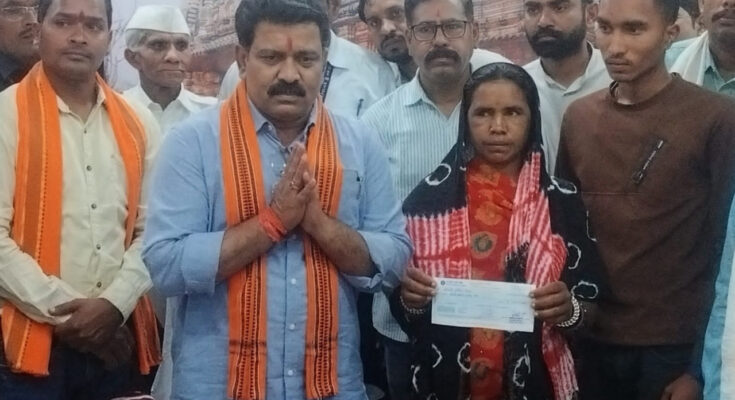 On the instructions of Chief Minister Shri Vishnu Dev Sai, Deputy Chief Minister Shri Vijay Sharma today paid a courtesy visit to the family of deceased Sadhram Yadav in the meeting room of the Collectorate office of Kabirdham district and presented a check of Rs 20 lakh to the family members of deceased Sadhram Yadav. While taking the cheque, Sadhram’s wife Mrs. Pramila Yadav, son Mr. Jaleshwar Yadav, brother Mr. Siddharam Yadav, village elders Mr. Kajelal Yadav, Mr. Paras Sahu, Mr. Pancharam Patel, Mr. Agahan Yadav, Mr. Golu Yadav, Mr. Bhagwat Gandharva were present.