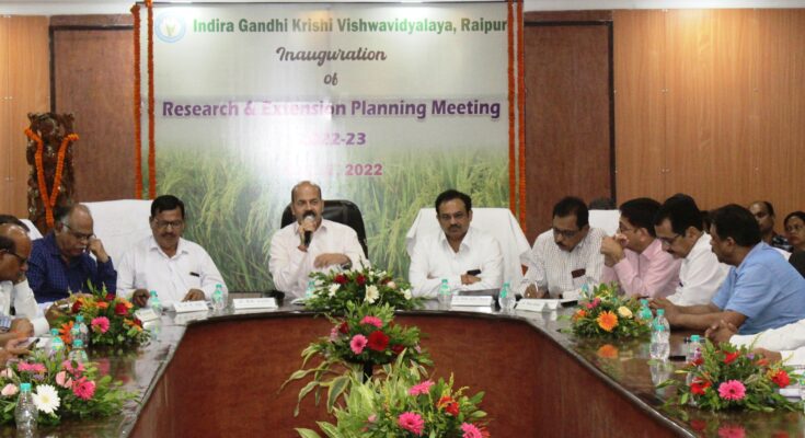 Raipur, 17 May 2022. The Vice Chancellor of Indira Gandhi Agricultural University, Dr. Girish Chandel has called upon the agricultural scientists to do research keeping in mind the needs and demands of national and international markets according to the changing global environment. He said that such varieties of different crops should be developed which are in high demand among the farmers. Along with this, emphasis should be given to reduce the cost of cultivation and increase the income of the farmer. Dr. Chandel was addressing the scientists involved in various agricultural research projects in the meeting hall of the College of Agriculture, Raipur, here today. Dr. Chandel stressed on getting the benefits of central and state sponsored schemes in agricultural research. Vice-Chancellor Dr. Chandel also inaugurated the renovated meeting room of Agriculture College, Raipur on this occasion.