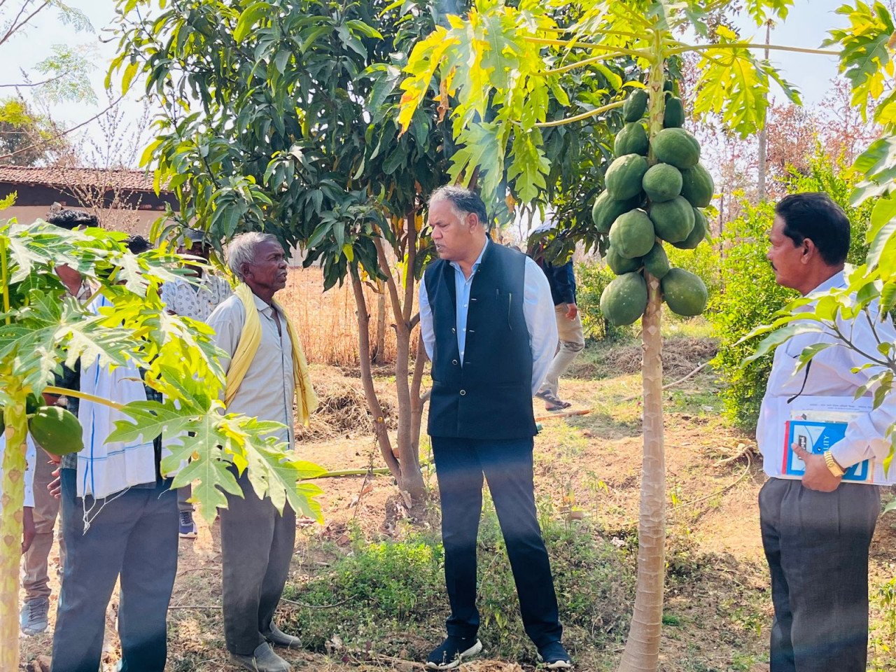 Collector Mr. P.S. Dhruv today visited village Bundeli of Vananchal in Manendragarh block. During this, the Collector inspected the orchards and vegetable cultivation of many farmers by walking about 4 kilometers. Under the National Horticulture Mission, farmers Charkuram, Kisan Singh, Gajadhar, Chandrapratap Singh of Bundeli village have planted fruit plants of different species in one hectare and cultivated vegetables by taking advantage of the river alluvial scheme. Apart from planting mango orchard, these farmers have also planted pomegranate, papaya, banana etc.
