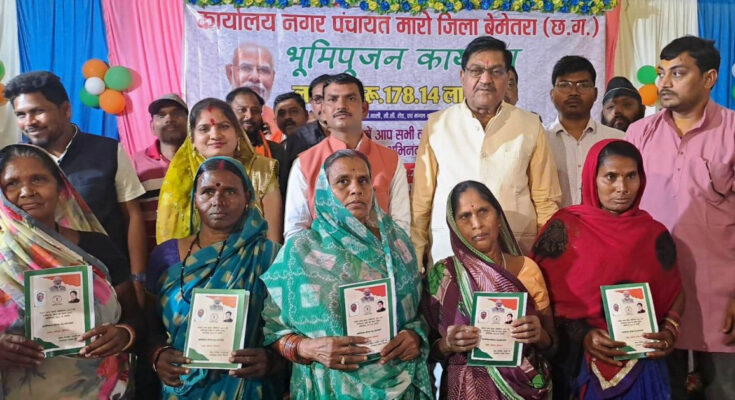 Food Civil Supplies and Consumer Protection Minister Shri Dayaldas Baghel participated in the Bhoomi Pujan program in Nagar Panchayat Maro of Navagarh development block of Bemetara district. He performed Bhoomi Pujan of various development works worth Rs 1 crore 78 lakh 14 thousand. Bhoomi pujan of development works includes RCC drain, CC road, and Mangal Bhawan in various wards. The Food Minister also distributed new ration cards to the beneficiaries.