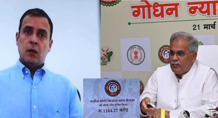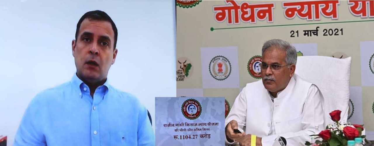 Raipur, 21 March 2021. Lok Sabha MP  Rahul Gandhi has said that Chhattisgarh government is at the forefront of helping farmers, poor and laborers. He said that Bhupesh government of Chhattisgarh is taking good steps one after the other. The Government of Chhattisgarh is fulfilling the promises made to the people. Lok Sabha MP  Rahul Gandhi was addressing the program organized at the Chief Minister’s residence Raipur under the Rajiv Gandhi Kisan Nyay Yojana and Godhan Nyay Yojana today. On this occasion, Chief Minister Bhupesh Baghel transferred an amount of Rs 1104 crore 27 lakh to the account of 19 lakh farmers of Chhattisgarh state. This amount has been given to the farmers as the fourth installment under the Rajiv Gandhi Kisan Nyay Yojana, With this, a total amount of Rs 5628 crore has been given to the farmers as exchange assistance. The Chhattisgarh government has fulfilled its promise of giving 10 thousand rupees per acre of assistance to farmers by giving fourth installment today. On this occasion, the Chief Minister Mr. Bhupesh Baghel, under the multi-pronged cattle justice scheme of the Chhattisgarh Government, more than one lakh 62 thousand cattle herders and villagers, in the last one month, the amount of cow dung purchased in the last month, directly to the amount of Rs. Transferred to account. It is worth mentioning here that under the Godhan Nyaya Yojana, which started on the day of Hareli festival, July 20, 2020, Rs 88 crore has been paid to the state’s cattle rearers and villagers. 7 crore 55 lakhs was transferred directly to his account against the value of cow dung. It is worth mentioning here that under the Godhan Nyaya Yojana, which started on the day of Hareli festival, July 20, 2020, Rs 88 crore has been paid to the state’s cattle rearers and villagers. 7 crore 55 lakhs was transferred directly to his account against the value of cow dung. It is worth mentioning here that under the Godhan Nyaya Yojana, which started on the day of Hareli festival, July 20, 2020, Rs 88 crore has been paid to the state’s cattle rearers and villagers.