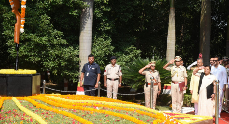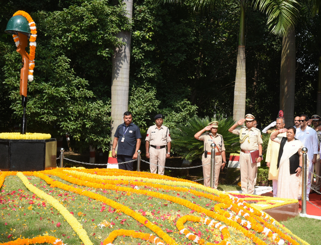 On the occasion of Police Commemoration Day, Governor Ms. Anusuiya Uikey and Home Minister Mr. Tamradhwaj Sahu paid homage to the martyrs by paying floral tributes at Amar Jawan Stambh of Shaheed Vatika, Rajiv Smriti Van today. Parliamentary Secretary Shri Vikas Upadhyay, Chief Secretary Shri Amitabh Jain, Director General of Police Shri Ashok Juneja and senior police officers were present on the occasion.