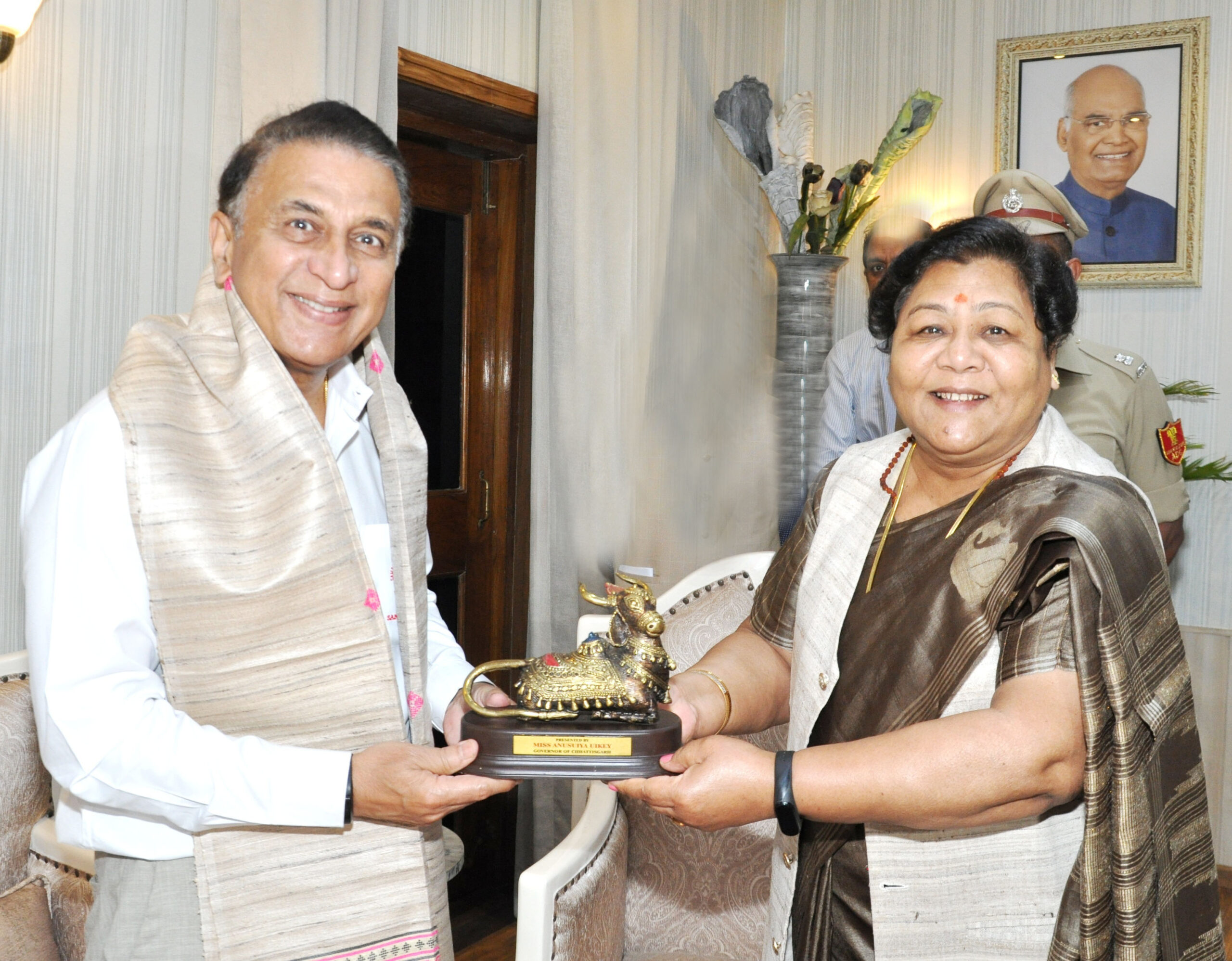 The Governor honored Shri Gavaskar with shawl and quince and said that it is a matter of happiness for the people of Chhattisgarh that a great player like you has come to Chhattisgarh. I congratulate you on behalf of the entire Chhattisgarh people. You are the pride of our country. You have made matchless contribution towards the country through your game. The Governor also presented the insignia to Mr. Gavaskar.