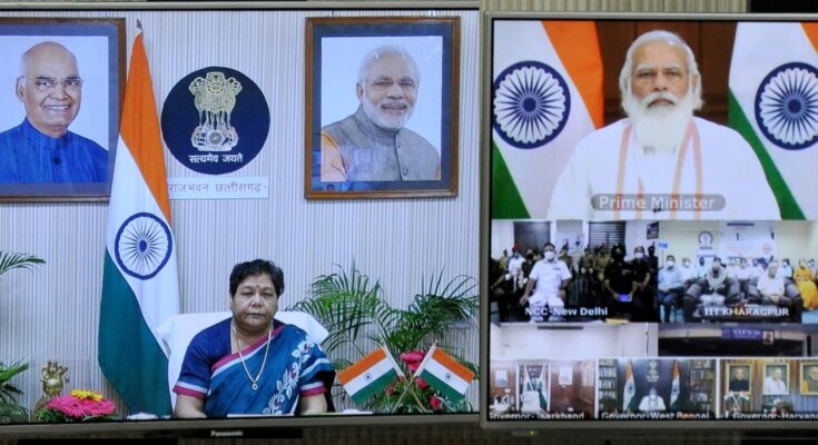 Raipur, 29 July 2021. The Prime Minister, Shri Narendra Modi, today launched the Initiative/Module under the National Education Policy-2020 from New Delhi. Union Education Minister Shri Dharmendra Pradhan, Chhattisgarh Governor Ms. Anusuiya Uikey, Governors/Lt. Governors of other States/UTs, Chief Ministers of States, Educationists, Heads of Higher Education Institutions, Parents and Students participated in this webinar.