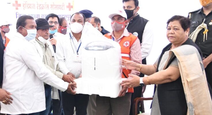 Raipur, 06 March 2022. Governor Ms. Anusuiya Uikey, during her three-day stay in Jagdalpur, on the last day today, on behalf of Red Cross Society at Circuit House, Jagdalpur, provided 5 nos. of oxygen concentrator and hygiene kit to help the needy people of Bastar district. Ms. Uike donated 1-1 oxygen concentrator to 5 Block Medical Officers of the district and Hygiene Kit to Mitanin. During this, Ms. Uike took information about the activities conducted by the Red Cross Society in Bastar district and appreciated the work being done by them for human service. He asked to make efforts to meet the shortage of doctors through Red Cross and also to take the services of retired doctors for this purpose.