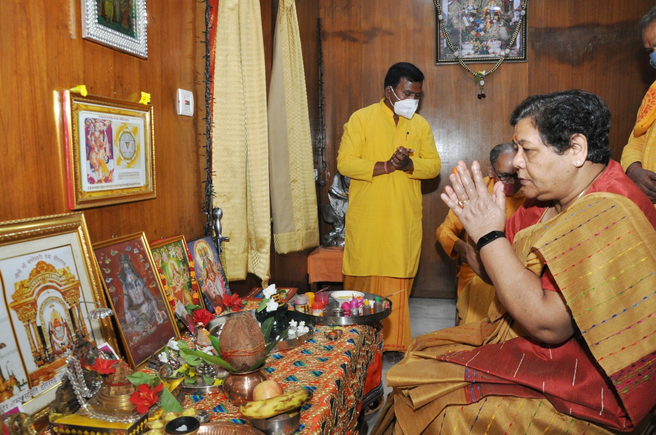 Raipur, 26 May 2021. Governor Ms. Anusuiya Uike today participated in the Gayatri Yagya organized for the freedom from corona infection from the country and the state at Raj Bhavan under the aegis of All World Gayatri Parivar Shanti Kunj Haridwar. On this occasion, the Governor prayed to mother Gayatri and wished to free the country and the state from corona infection, promote environment and good health of the people of the state.