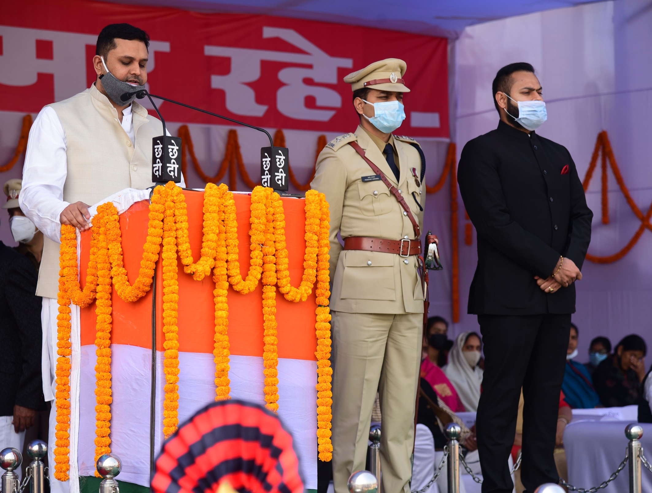 Raipur, 26 January 2021. In Bilaspur district, the 72nd Republic Day was celebrated with joy and gaiety. Minister of Higher Education, Skill Development, Technical Education and Employment, Science and Technology, Sports and Youth Welfare, Mr. Umesh Patel hoisted the flag and took the salute of the parade at the main function held at the Police Ground of District Headquarters.