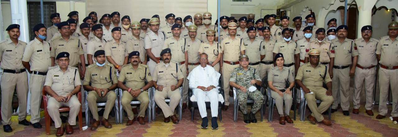 Raipur 22 March 2021.  Home Minister Tamradhwaj Sahu today felicitated police officers and employees for solving the mystery of the murder of Khudumuda in his Durg Niwas office during his stay in the fort. He congratulated 50 police officer-employees including Inspector General of Police, Durg Range, Mr. Vivekananda Sinha and Superintendent of Police, Durg Mr. Prashant Thakur, on this success. On this occasion, Home Minister Shri Sahu also shared his experiences with the officials. He announced an award of Rs 2 lakh for the police of Durg district and said that he would be given a citation soon.