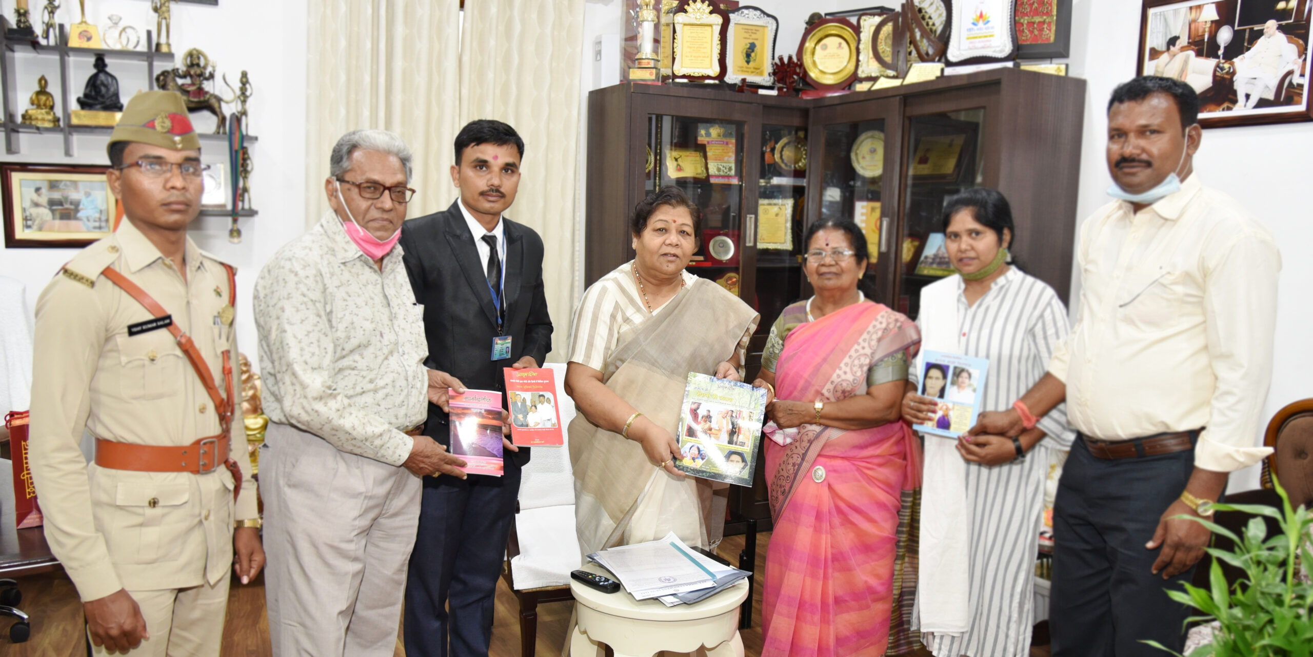 Raipur, 19 November 2021. The delegation led by Smt. Phulwadevi Kange, National President of Shri Manjhi International Socialism Adivasi Kisan Sainik Sanstha, New Delhi, met Governor Ms. Anusuiya Uikey at Raj Bhavan. He invited the Governor to attend the commemoration and honor program of tribal Jannayak Krantiveer Kangla Manjhi ji. On this occasion Shri Raju Uikey, Shri K.D. Kange, Dr. Pardeshi Ram Verma and Mr. Vijay Kumar were present.