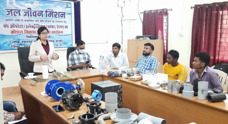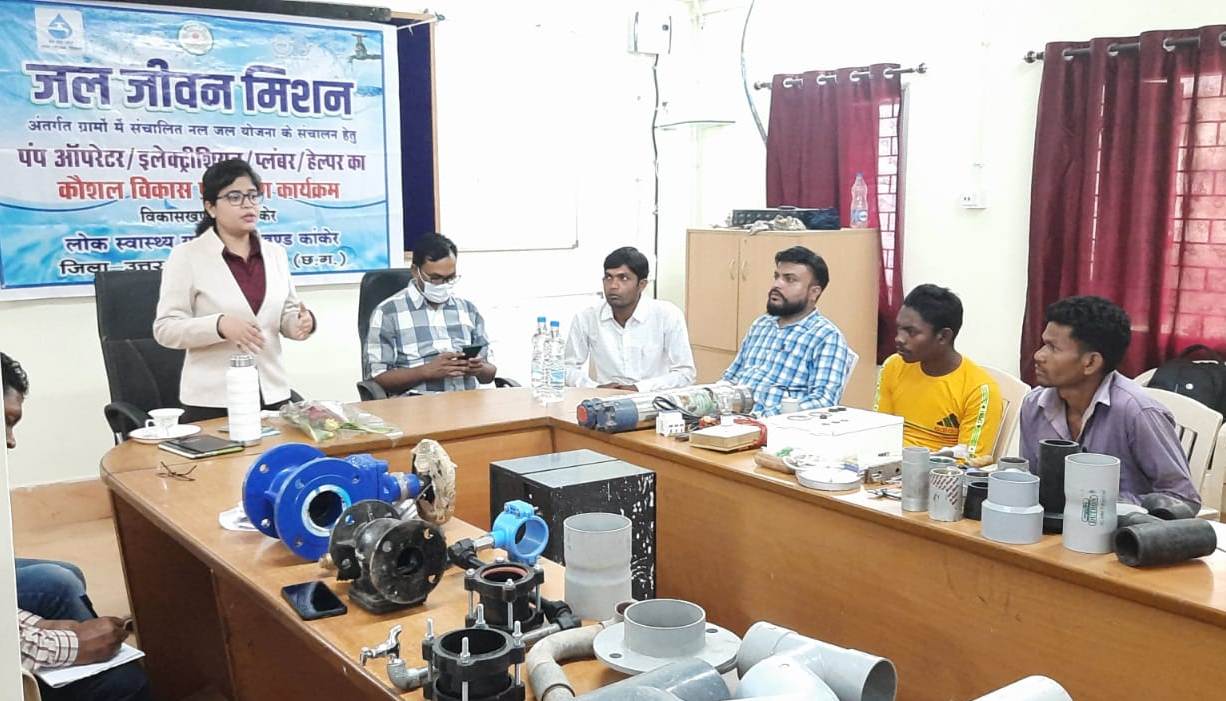 Skill development training is being imparted by Public Health Engineering Department for better implementation of tap water schemes run under Jal Jeevan Mission in rural areas of the state. In this episode, training program of six villages of the first batch of Kanker block under the skill development training program of pump operator, electrician, plumber, helper for operation of tap water scheme operated in villages under Jal Jeevan Mission in Kanker district, Janpad Panchayat in Kanker. Done. In which participants from Dhanelikanhar, Govindpur, Kokpur, Talakhurra, Bagodar and Sidesar were present.