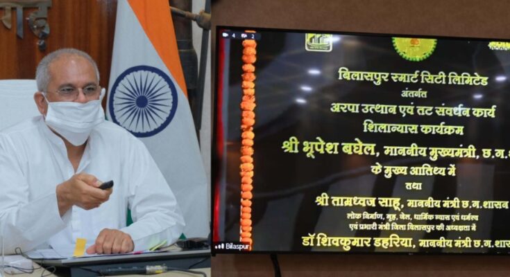 Raipur, 16 May 2021. Chief Minister Mr. Bhupesh Baghel has said that Jeevadayini Arpa river is the pride of Chhattisgarh, not only of Bilaspur. This river is associated with our cultural identity. The first word of the state song is also dedicated to the river Arpa. He said that the state government has taken several steps from time to time to revive and make Arpa flowy and we will continue to do everything possible for it. In a virtual program held at his residence office here today, the Chief Minister expressed his views to this effect while laying the foundation stone for Arpa upliftment and water conservation work at a cost of Rs 93 crore 70 lakh in Bilaspur. The program was presided over by Home Minister and Minister in-charge of the district Mr. Tamradhwaj Sahu. Home Minister and Minister of Urban Administration and Development Department Dr. Shivkumar Dahria virtually joined the program as a special guest.
