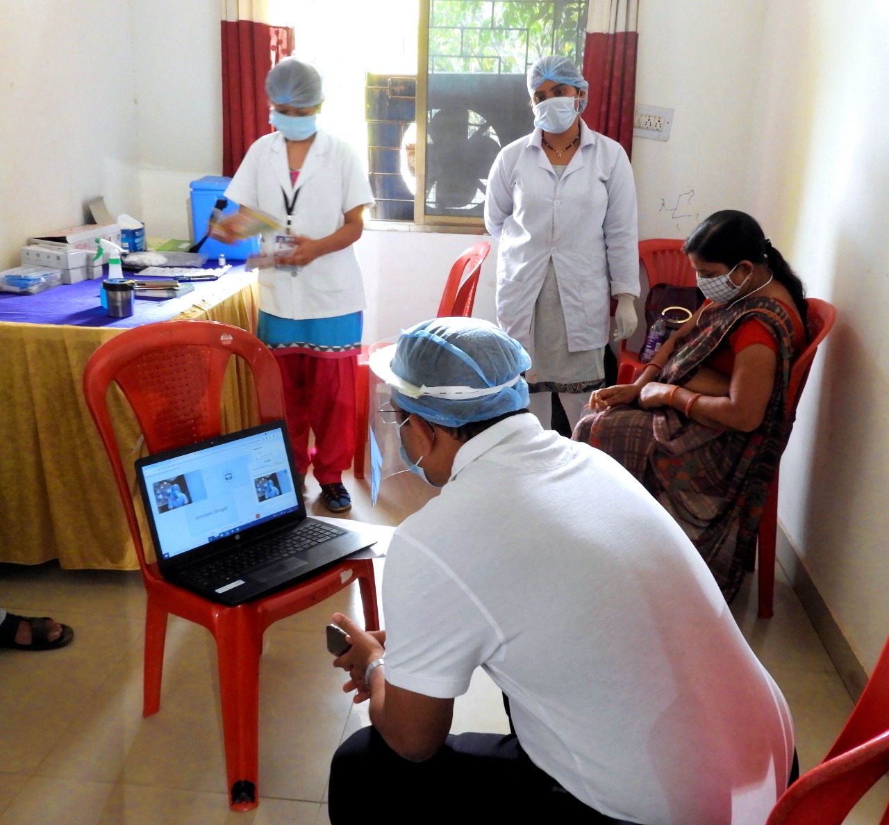 Raipur, 01 May 2021. In the virtual presence of Mr. Amarjit Bhagat, Minister of Food, Civil Supplies and Consumer Protection, Planning, Economic-Statistics and Culture and in-charge Minister of Balod district, Antyodaya of rural area of ​​18 years to 45 years in District Headquarters New Town Hall Vaccination Center The Kovid-19 vaccination of cardholder beneficiaries began. On this occasion, the first vaccine was given to the beneficiary Smt. Bhagwantin Chandrakar, Antyodaya ration card holder of village Jungera of Balod development block. Minister Shri Bhagat interacted with the benevolent Smt. Bhagwantin Chandrakar and conveyed his best wishes to him.