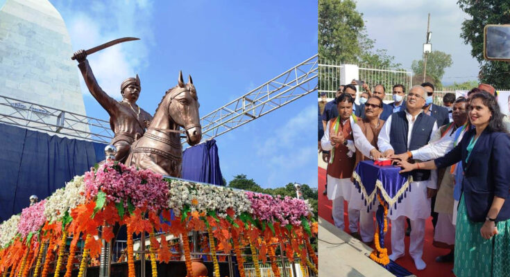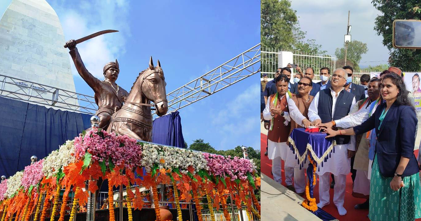 Raipur, 10 December 2021. A life-size statue of Martyr Veer Narayan Singh will be installed at Jaistambh Chowk in the capital Raipur. Martyr Veer Narayan Singh was hanged by the then British government on 10th December 1857 at Jaistambh Chowk itself. Chief Minister Shri Bhupesh Baghel made an announcement to this effect while addressing a public meeting organized after paying homage to Veer Narayan Singh on his martyrdom day at Sonakhan (District Balodabazar). Mr. Baghel has also announced to make Sonakhan a tehsil. On the occasion, the Chief Minister also unveiled a life-size statue of Martyr Veer Narayan Singh riding a horse in the Martyrs Memorial Complex. He also gifted various development works worth Rs 28 crore 60 lakh here. Of these, a bridge built on the Jonk river on Bangalapali to Maharaja road worth Rs. 9 crore 60 lakh and the Eklavya hostel at a cost of Rs. 16 crore and the first of the construction of stairs in Kurupath at a cost of Rs. 2 crore 67 lakh in Kurupath. Includes groundbreaking work. The program was presided over by the Minister of Tribal and Scheduled Castes Development, Dr. Premsai Singh Tekam, and Industries Minister Mr. Kawasi Lakhma, Parliamentary Secretary and local MLA Mr. Chandradev Rai, Ms. Shakuntala Sahu, Chairman of CG Textbook Corporation Mr. Shailesh Nitin Trivedi, as special guest. President of Krishak Kalyan Parishad Shri Surendra Sharma, District Panchayat President Shri Rakesh Verma and District President Shri Hitendra Thakur were present.