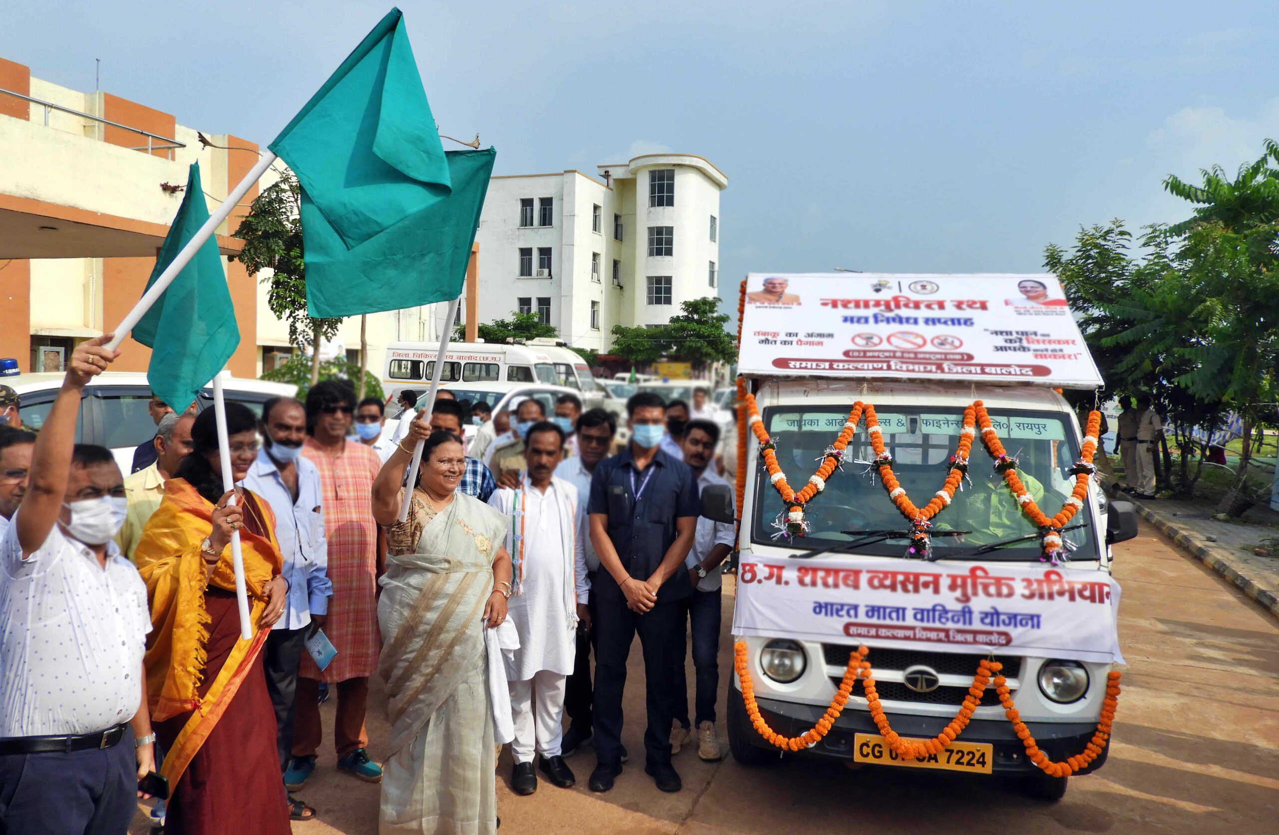 State’s Women and Child Development and Social Welfare Minister Mrs. Anila Bhendia today flagged off the drug de-addiction chariot from the Balod district hospital premises. Sanjari-Balod MLA Smt. Sangeeta Sinha, Collector Shri Janmejay Mahobe etc. were present on the occasion. Officials of Social Welfare Department said that this chariot will bring public awareness for drug de-addiction by visiting from village to village.