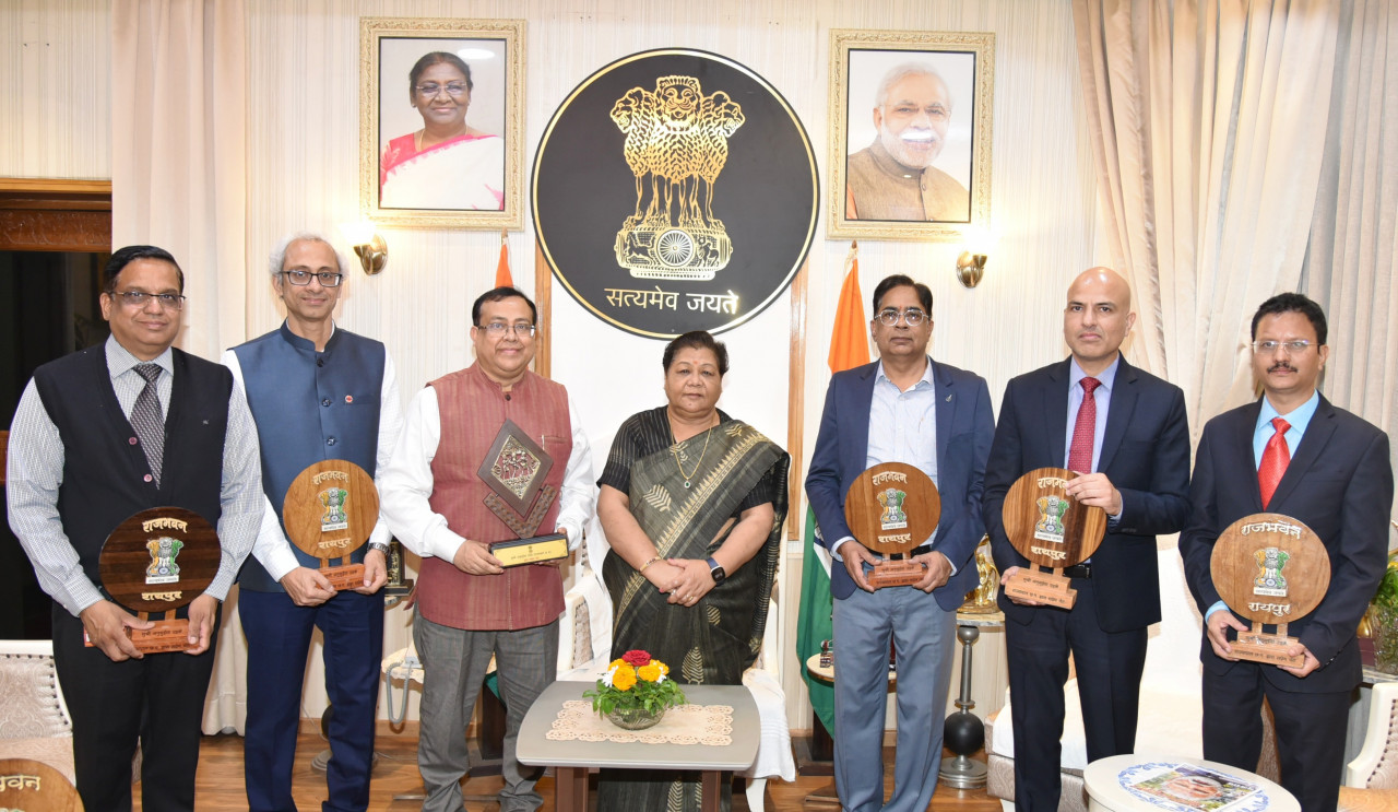Shri Deepak Kumar Basu, Managing Director and State Head of Indian Oil Corporation Limited, Raipur called on Governor Ms. Anusuiya Uike at Raj Bhavan today. On this occasion, the Governor along with Shri Deepak Kumar Basu present Shri T.N. Sunder Rajan, Mr. Shashi Chowdhary, Mr. Sanjeev Mathur and Mr. Amit Kumar Khayaliya were honored with mementos.